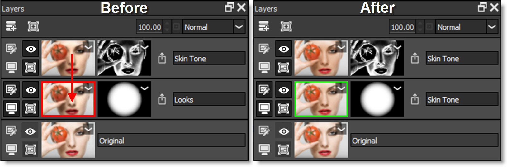Enables/Disables the filter, masks, Blend Mode and Opacity. A red X appears on the image and mask thumbnails when disabled.